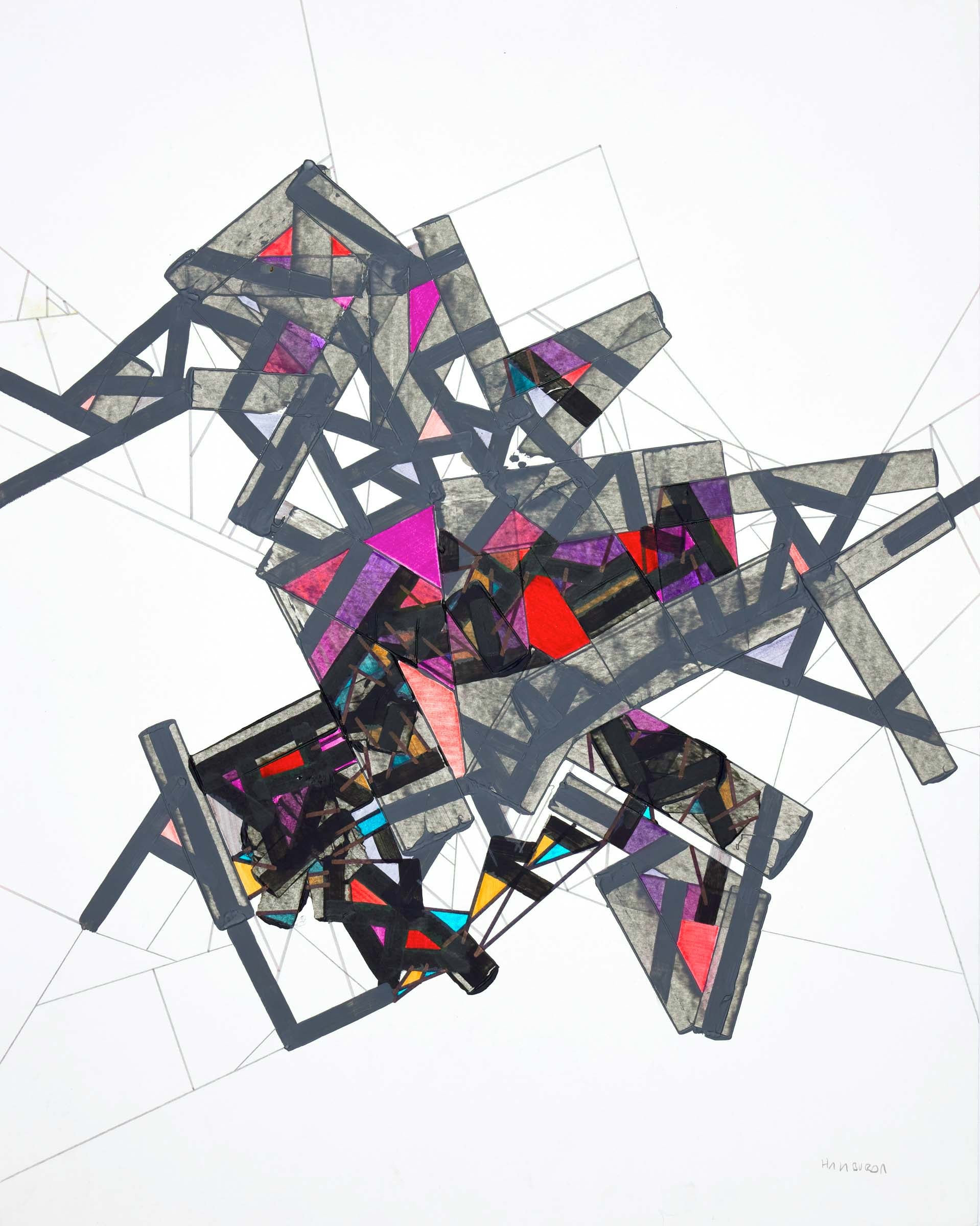 Acrylic, felt tip colored pen and pencil on white paper